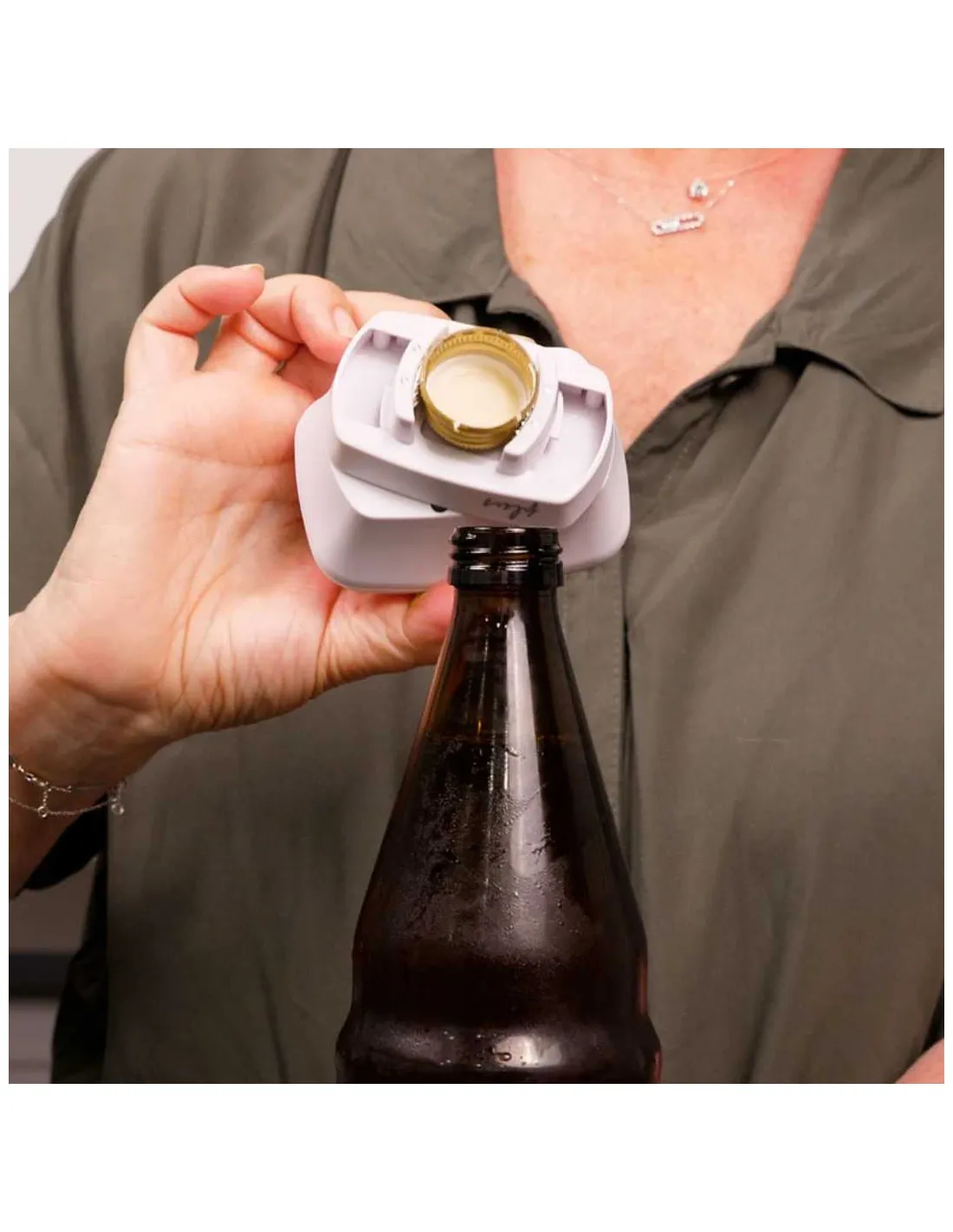Simplemente coloque el abridor sobre la tapa y presione el botón lateral.
