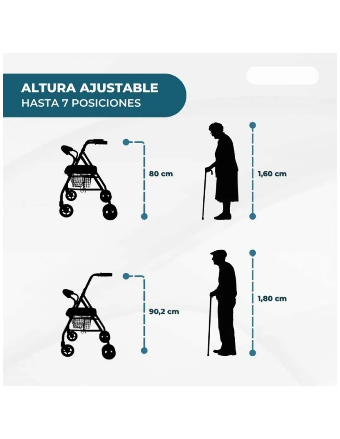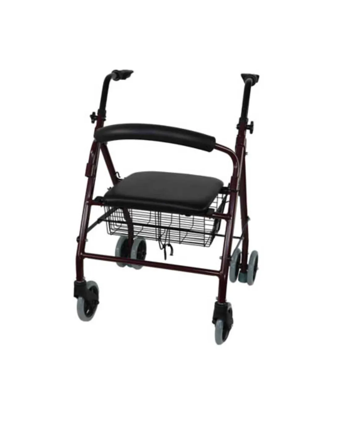 Andador de 4 ruedas con frenos que se activan por presión. Cuenta con dos ruedas delanteras giratorias 360º, un asiento confortable que permite el descanso, un respaldo acolchado. Se ajusta en altura y además es plegable y de fácil almacenamiento. Posee una cesta para la compra.