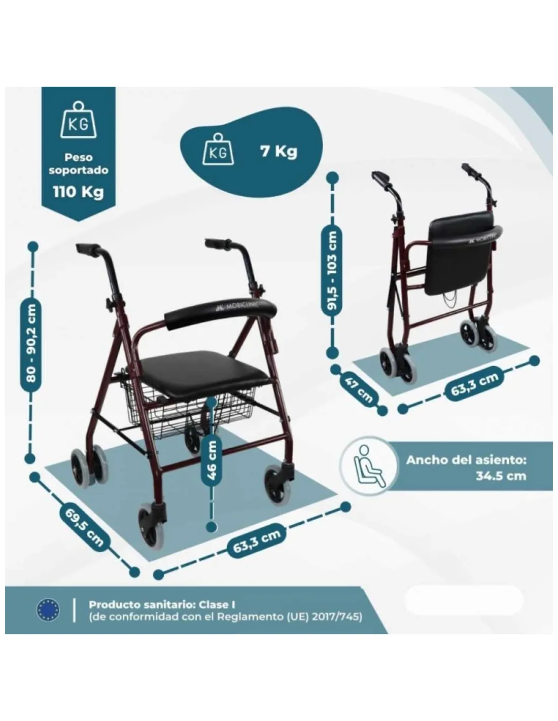 Posee una cesta para la compra (la cesta puede colocarse debajo del asiento o en la parte frontal del rollator). La estructura del andador está hecha de aluminio, pintada en su superficie y tubo anodizado en las empuñaduras.