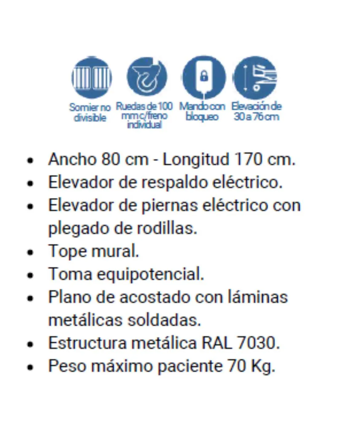 Carga normal de uso: 170 kg (colchón 20 kg, paciente 135 kg y accesorios 15 kg)