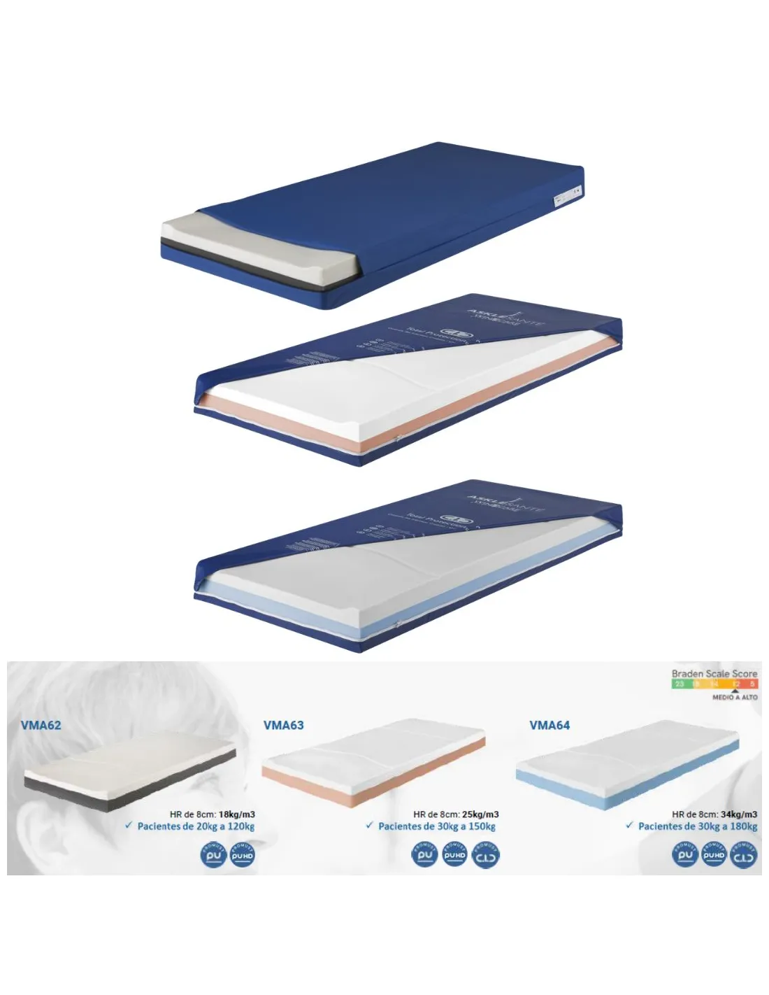 Los Modelos VMA63 y VMA64 ayudan para la prevención de úlceras por presión en pacientes de riesgo medio a alto. Pacientes encamados más de 15 horas al día.