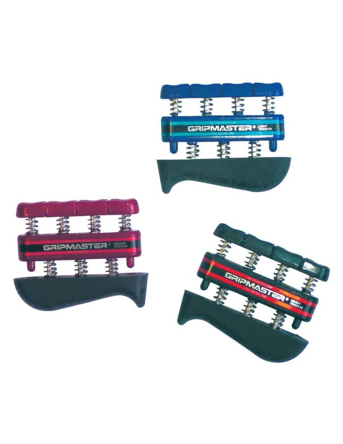 5 resistencias: ultra suave (amarilla) fuerza 0,7 kg, suave (roja) fuerza 1,4 kg, media (verde) fuerza 2,3 kg, firme (azul) fuerza 3,2 kg, extra firme (negra) 4,1 kg. El surtido de 5 Gripmasters, un popular dispositivo de rehabilitación de mano