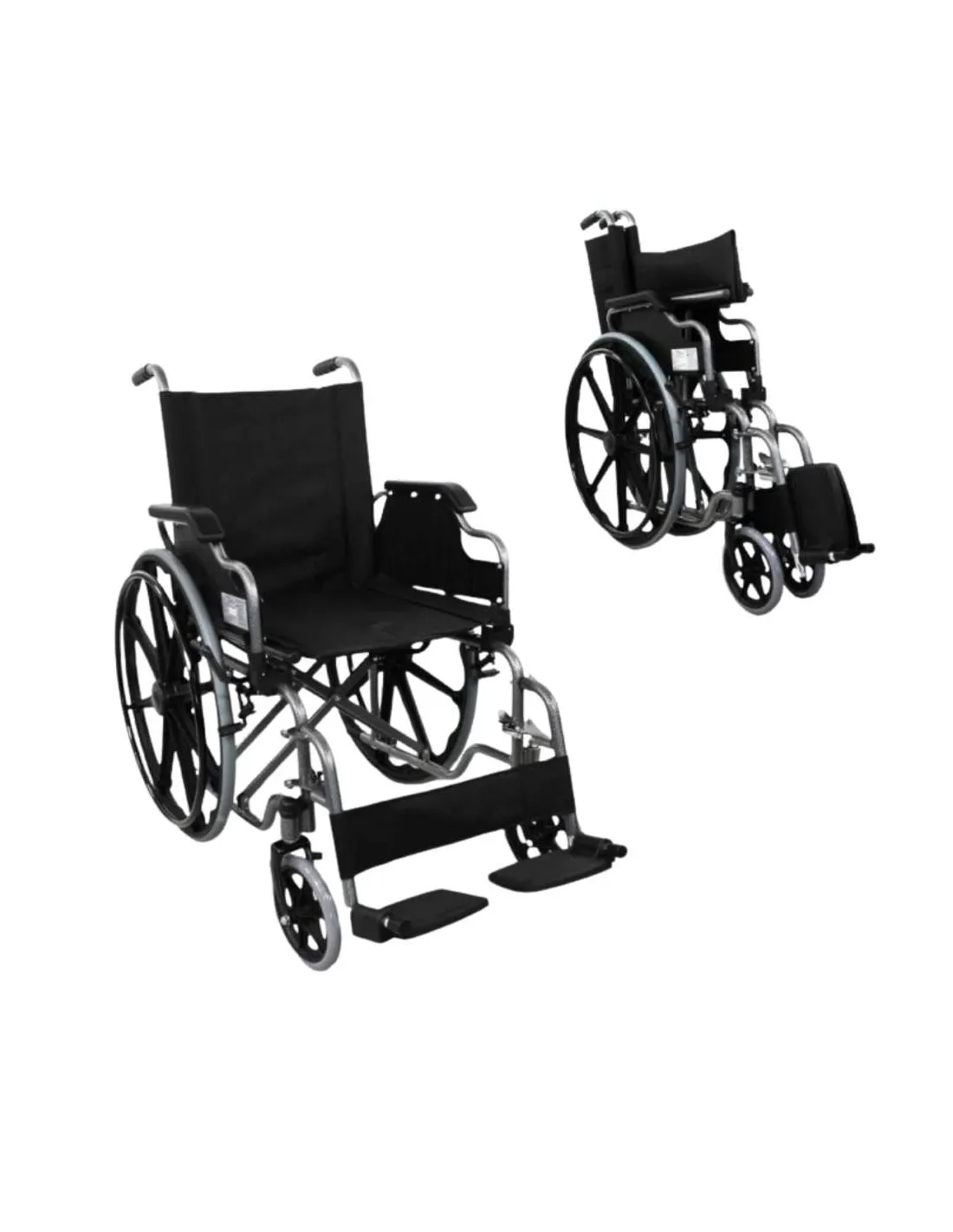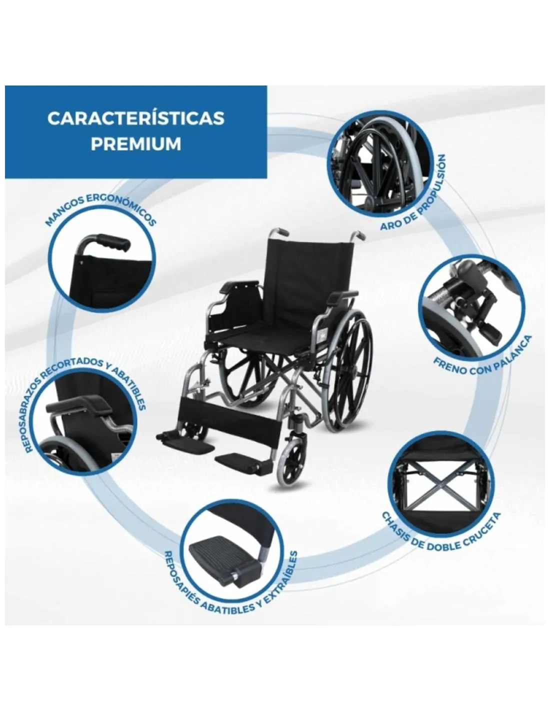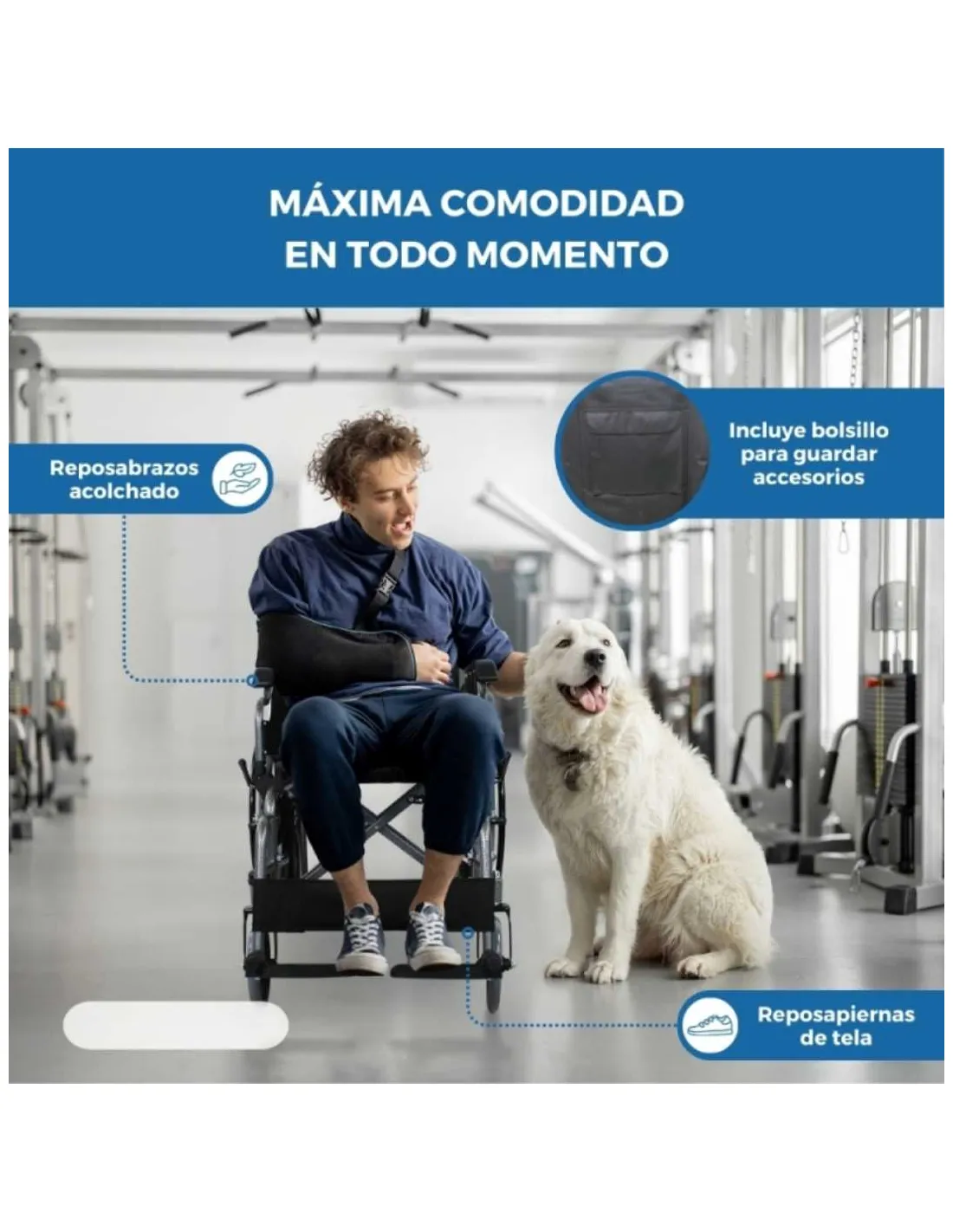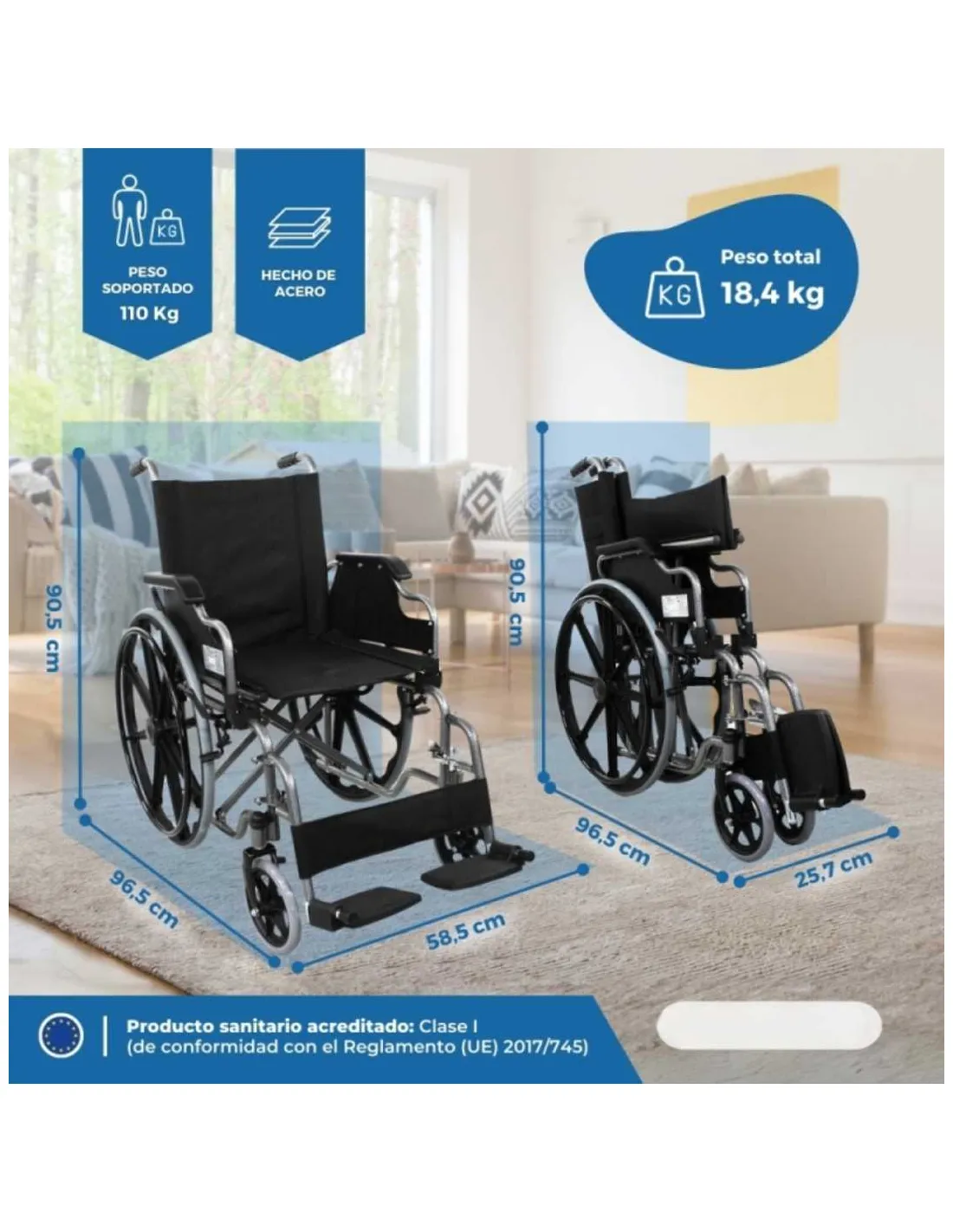Material: Acero. Reposabrazos abatibles. Reposapiés extraíbles. Ruedas macizas.