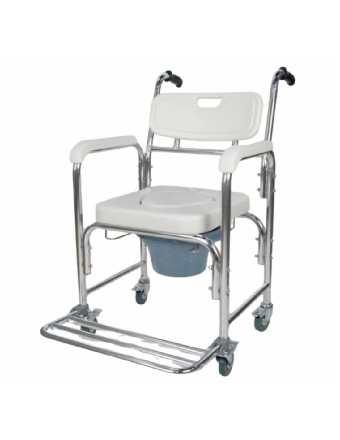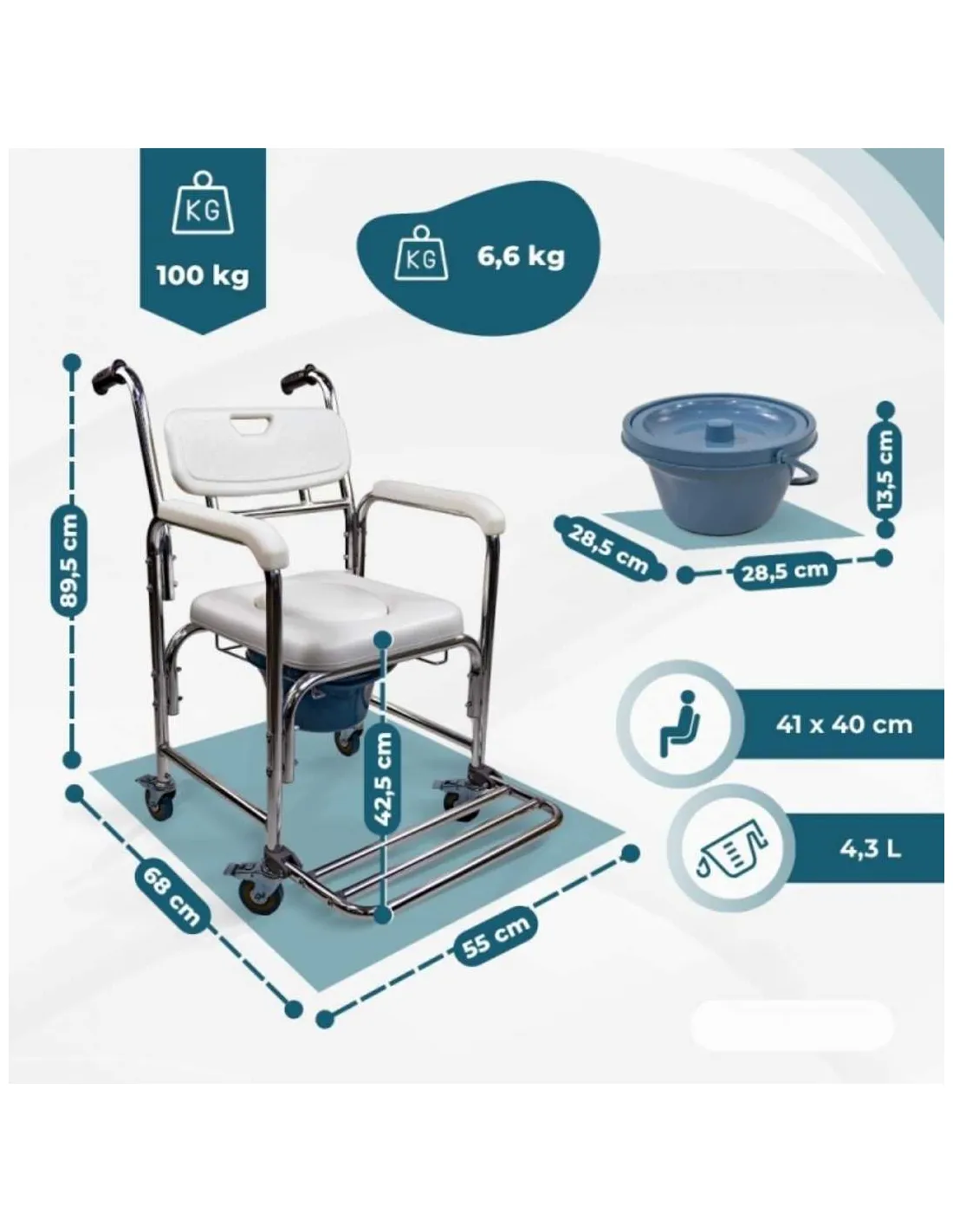 Dispone de un orinal sanitario extraíble de 4.3 litros, facilitando la higiene personal y garantizando mayor autonomía y privacidad. El recipiente puede extraerse para facilitar su limpieza y vaciado, mejorando el mantenimiento de la silla. Su estructura es de aluminio robusto y ligera, fácil de trasladar dentro del hogar sin esfuerzo y sin comprometer la estabilidad.