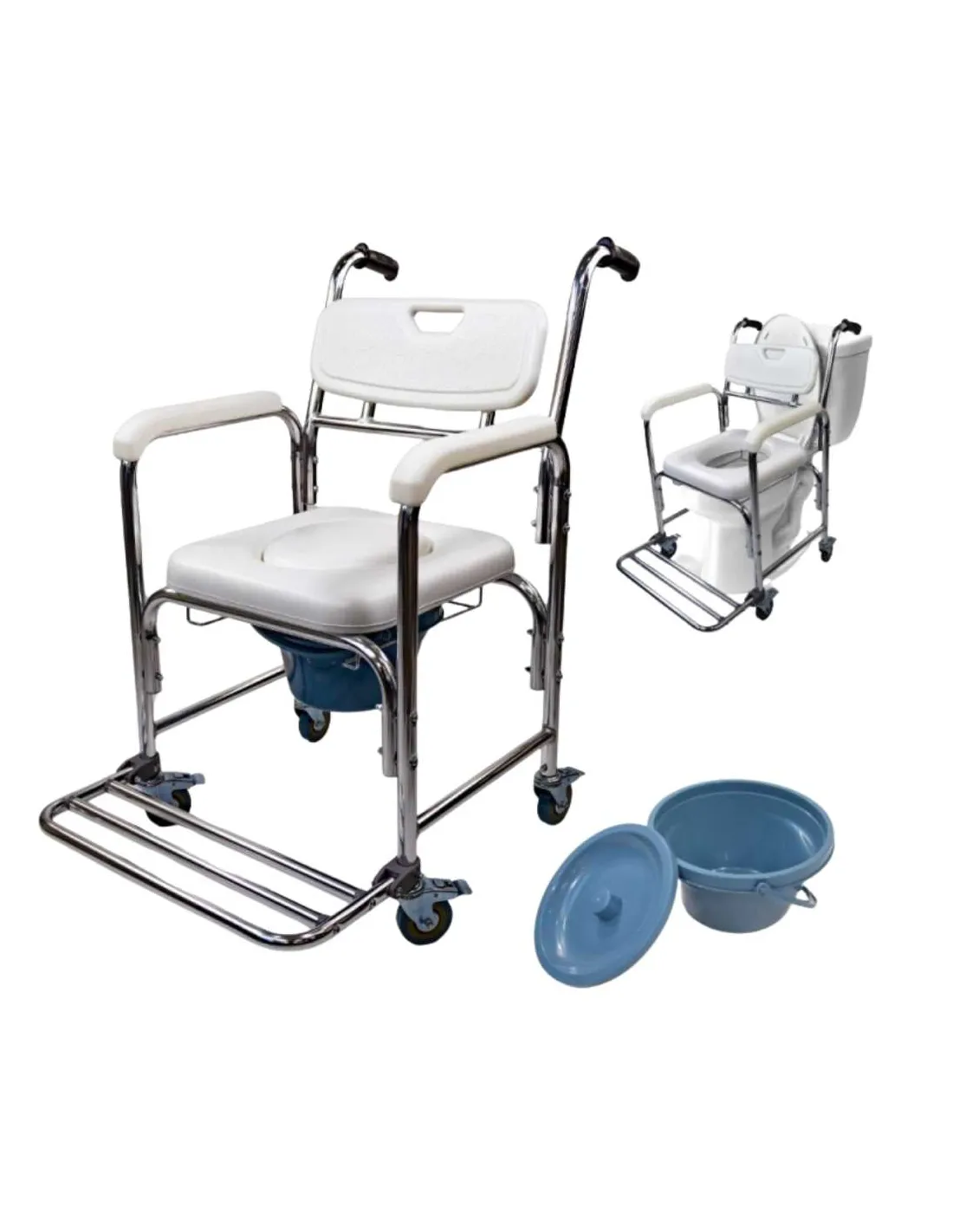 Es versátil y puede ser utilizada como silla con inodoro, silla de ducha, alzador de WC y silla de traslado, adaptándose a las necesidades de todos los usuarios. Cuenta con frenos en las cuatro ruedas que proporcionan mayor seguridad y evitan desplazamientos involuntarios.