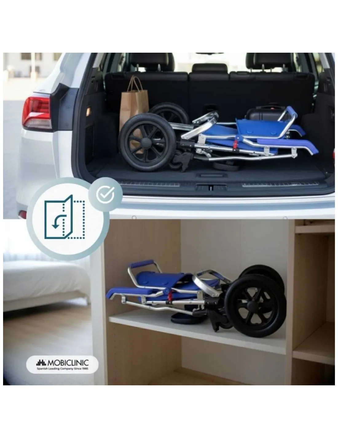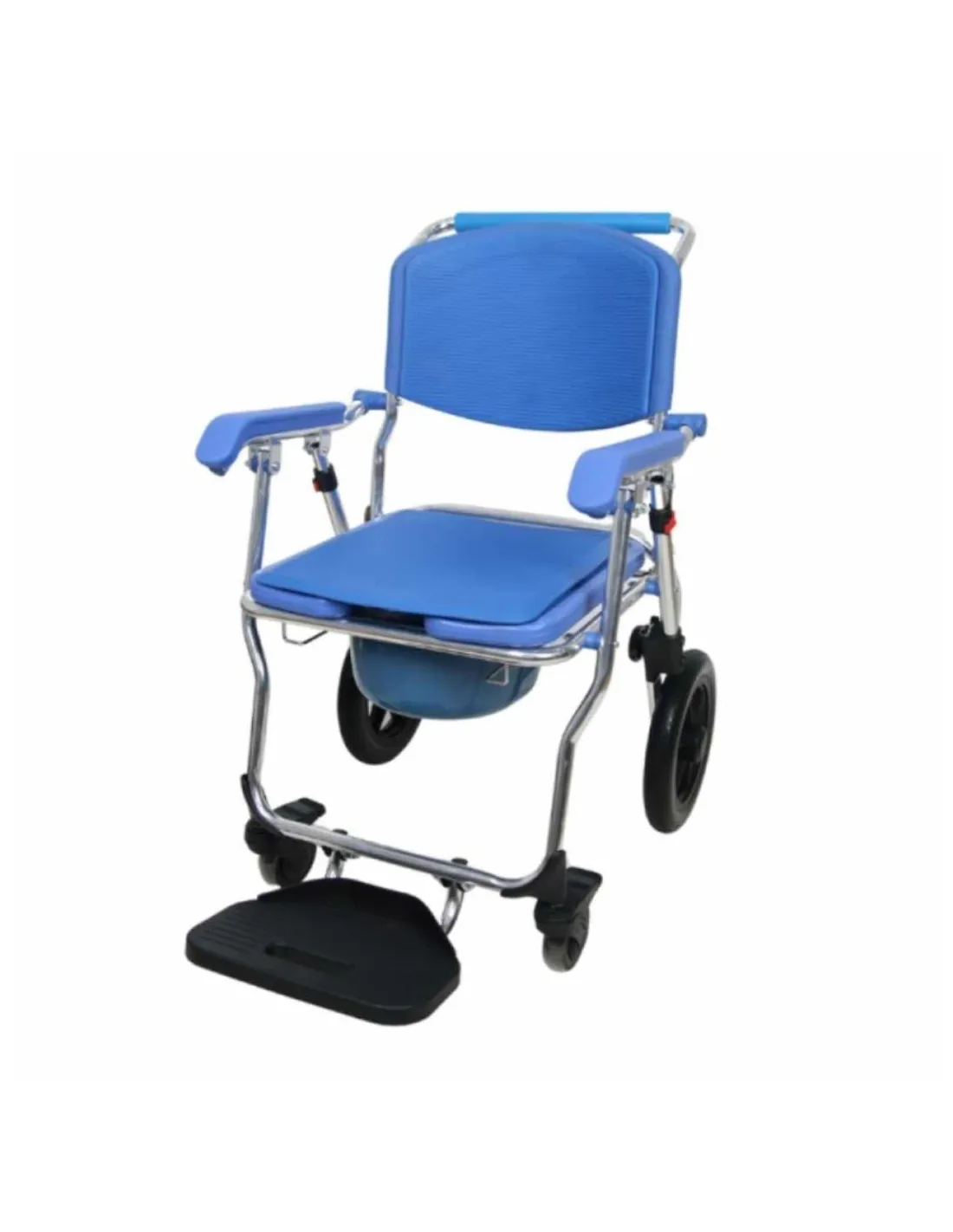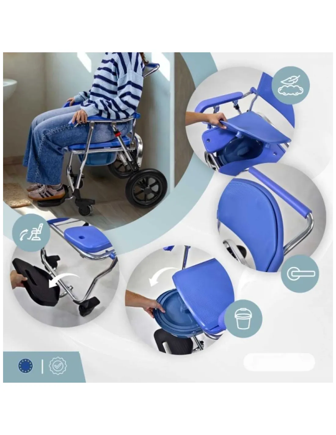 Su diseño es plegable lo que facilita el almacenamiento y transporte de la silla. Puede guardarse sin ocupar espacio y trasladarse de manera sencilla de una estancia a otra, ideal para residencias, hogares y hospitales. Su estructura está pensada principalmente para hacer más fáciles las tareas diarias, reduciendo los movimientos bruscos y las posturas forzadas.