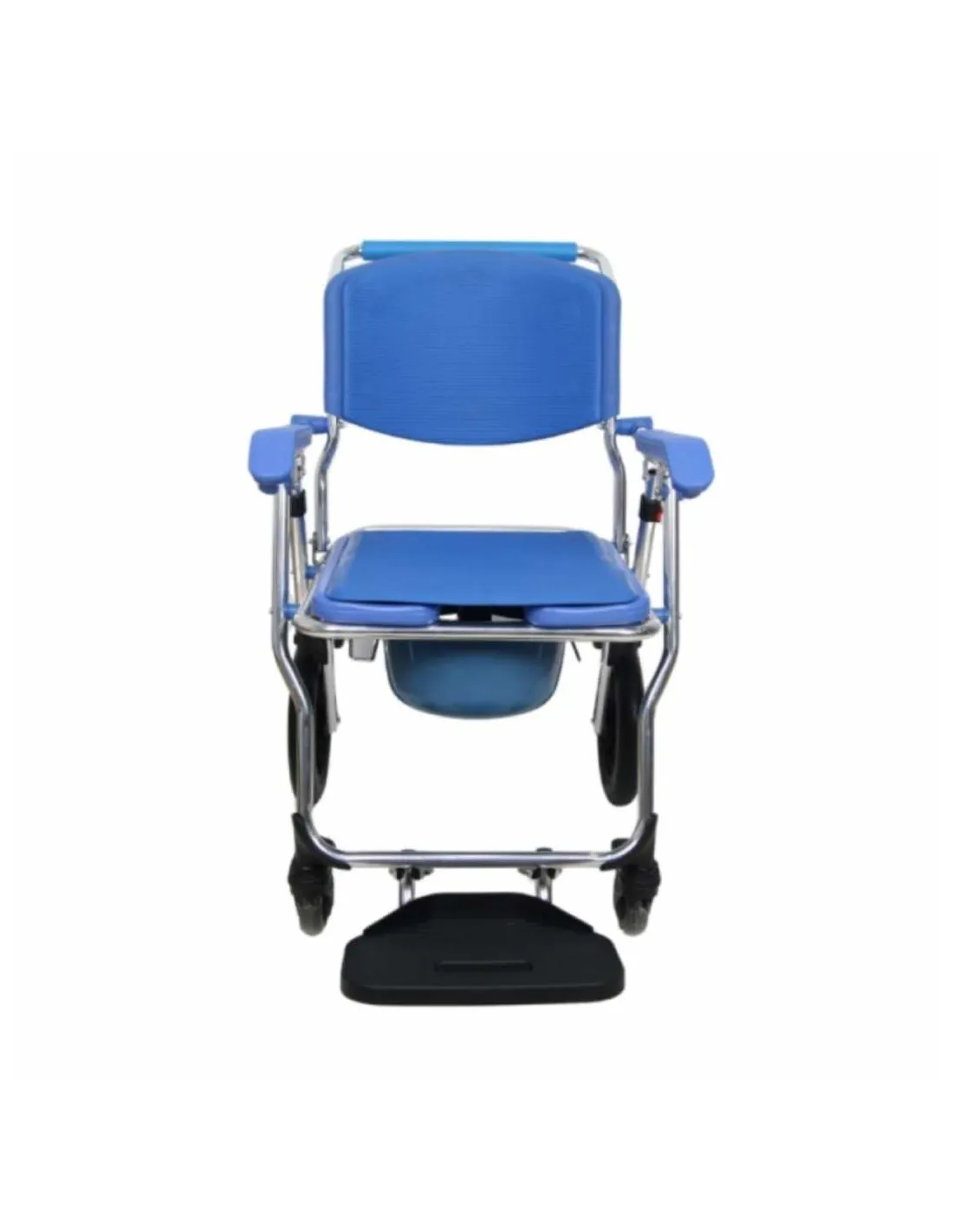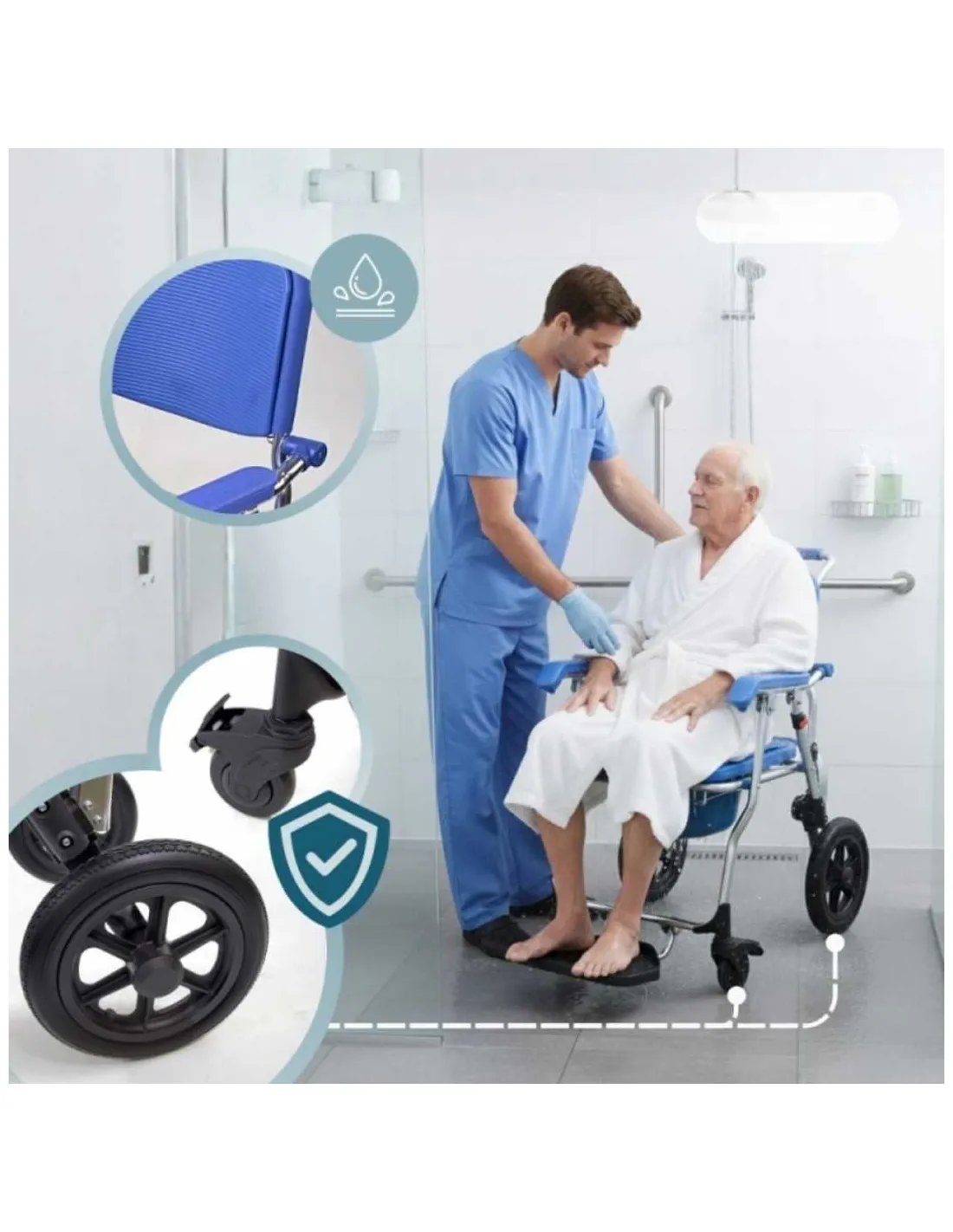 Sus ruedas cuentan con frenos que permiten bloquear la silla para mayor seguridad. Su reposapiés de gran tamaño ofrece un soporte cómodo para el paciente evitando posturas incómodas. Además, su asiento y respaldo son antideslizantes mejorando la estabilidad y garantizando mayor seguridad durante el aseo. Los elementos están pensados para garantizar comodidad tanto al usuario como al cuidador.