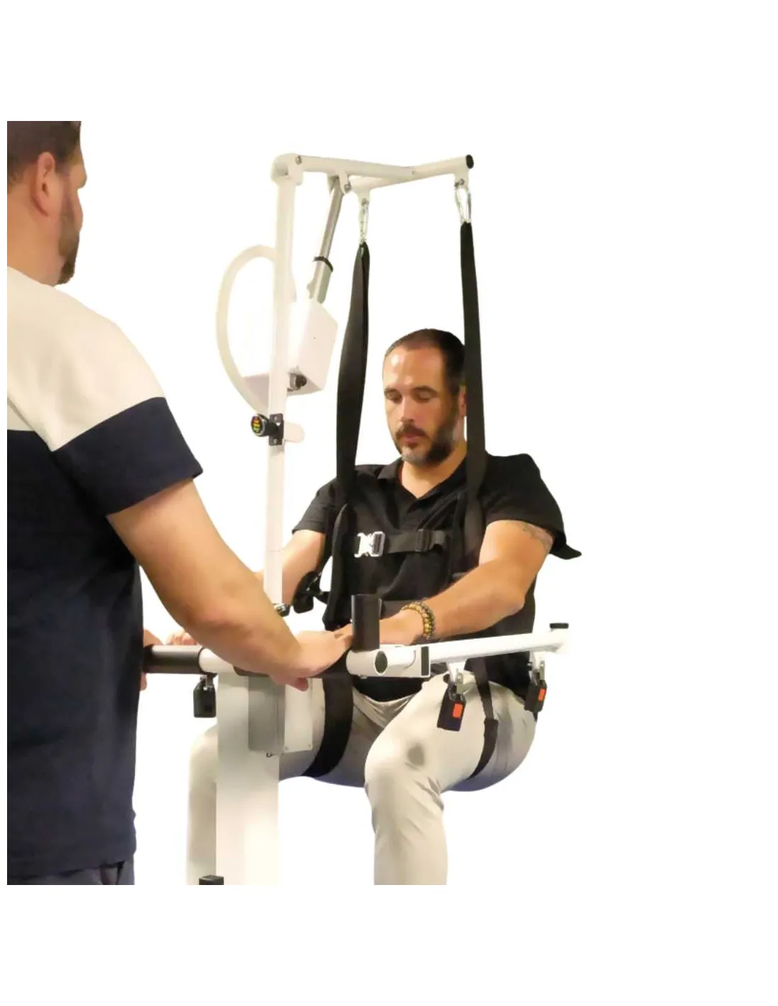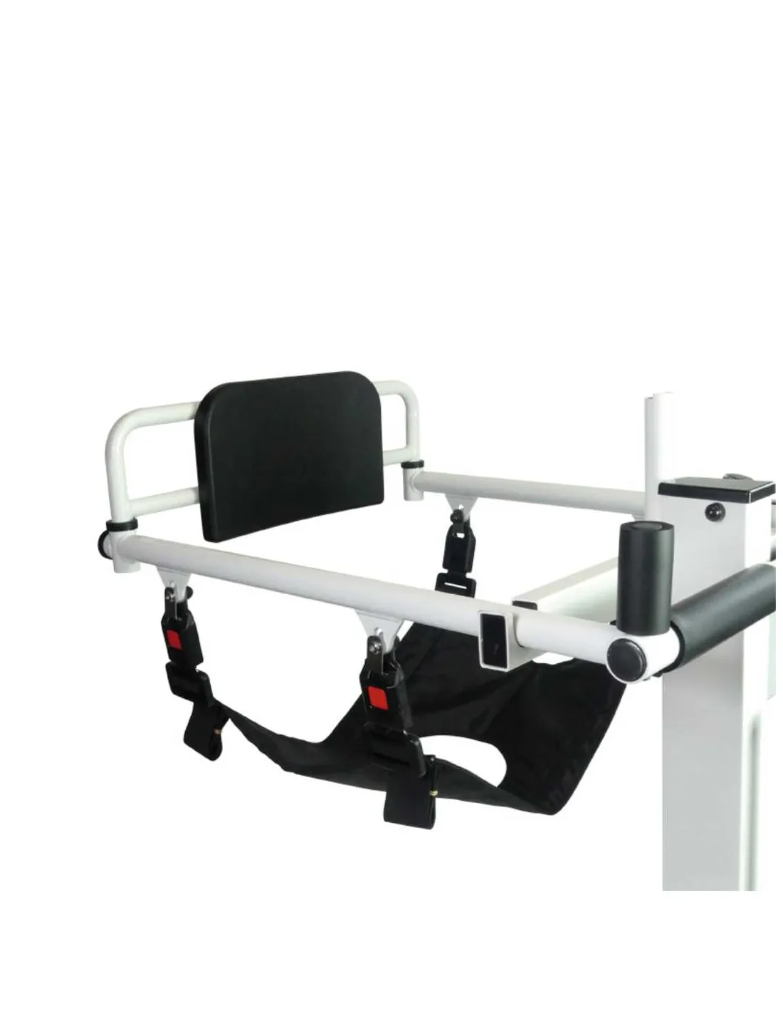 Desde la posición sentada, simplemente deslice el asiento blando bajo los glúteos del paciente y asegure las cuatro hebillas laterales. Tras colocar el respaldo de seguridad, simplemente levante la silla eléctricamente.