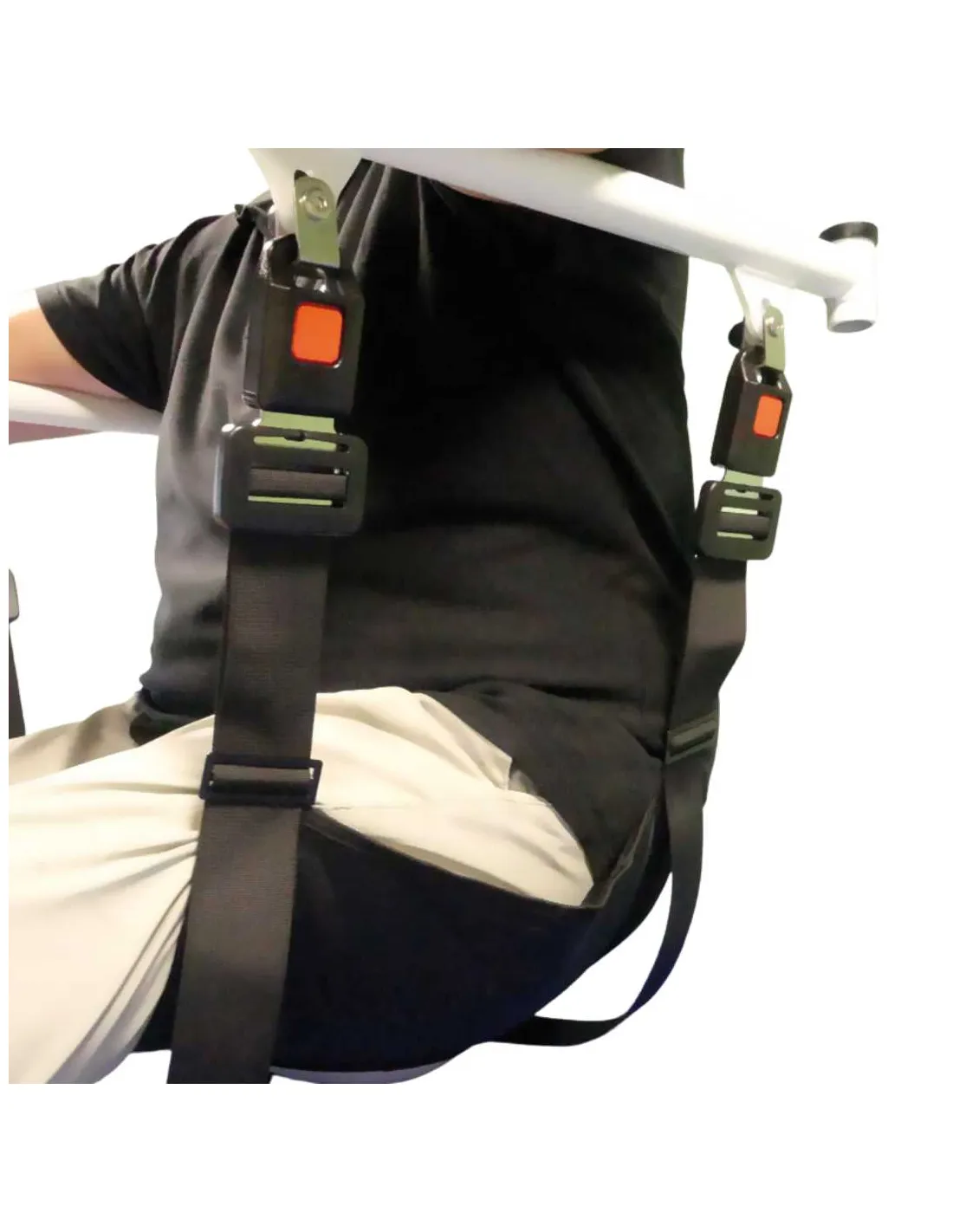 Desde la posición sentada, simplemente deslice el asiento blando bajo los glúteos del paciente y asegure las cuatro hebillas laterales.
