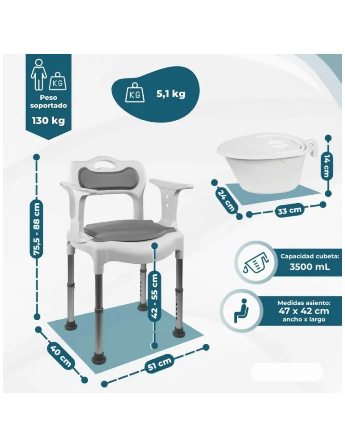 El orinal es extraíble y tiene una capacidad de 3500 ml, soportando 6 kg de carga, ofreciendo mayor autonomía y reduciendo la necesidad de un vaciado frecuente. Además, la limpieza es sencilla y rápida, manteniendo la silla siempre higiénica para su uso. Gracias a sus patas regulables, esta silla se adapta a 6 niveles de altura, con un rango se asiento entre 42 y 55 cm y una altura total de entre 75 y 88 cm. esto permite adaptarse a la estatura del usuario y a las diferentes necesidades.