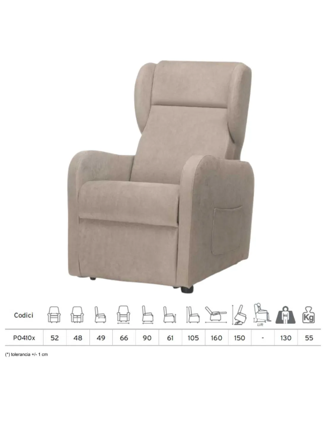 Altura reposabrazos: 61 cm. Altura total sentado: 105 cm. Altura total en posición elevación: 150 cm