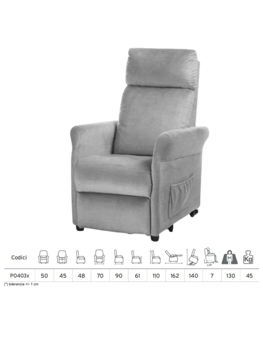 Altura reposabrazos: 61 cm. Altura total sentado: 110 cm. Altura total en posición elevación: 140 cm