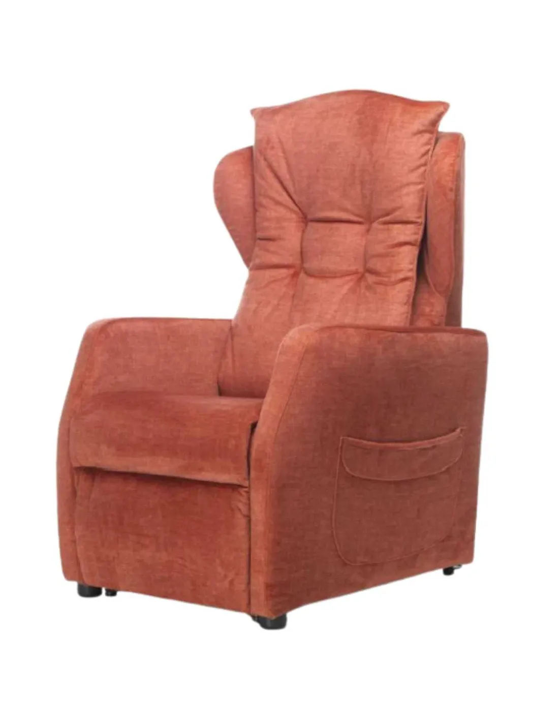 El sillón también cuenta con una función de elevación de pies, accionada por un motor que eleva al usuario. Este dispositivo de elevación ayuda al usuario a alcanzar una posición casi erguida, facilitando la postura de pie.